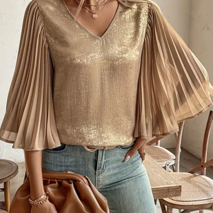 TEMU Koszula z długim rękawem, z siateczki, z plisami i dekoltem w serek