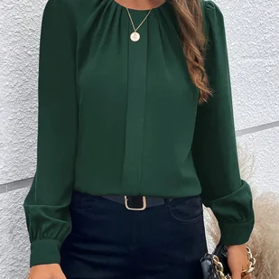 TEMU Elégantna Bluzka z Długim Rękawem w Stylu Bliskowschodnim - Jednokolorowa Koszula z Okrągłym Dekoltem i Plisowanymi Detalami, Pranie Maszynowe,