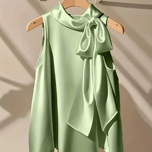 TEMU Elektryczna Bluzka w Kolorze Miętowej Zieleni z Kokardą - Okrągły Dekolt, Bez Rękawów, Jednokolorowa Koszula Poliestrowa na Każdą Porę Roku