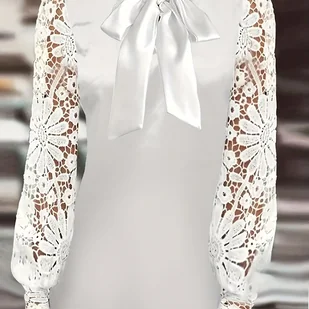 TEMU Kontrastowa koronkowa bluzka z wiązaniem pod szyją, elegancka bluzka z długim rękawem na wiosnę i jesień, odzież damska