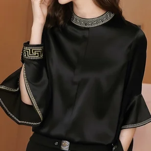 TEMU Koszula Damska Elegancka w Czarne z 3D Peoniami i Złotymi Akcentami, Bluzka z Długim Rękawem i Okrągłym Dekoltem - Regular Fit, Pranie Maszynowe
