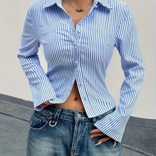 TEMU Koszula Damska w Paski z Długim Rękawem i Elegancką Koszulą - Nieprześwitująca Tkanina, Wstążkowy Kołnierzyk na Guziki, Nadruk Biało-Niebieski,