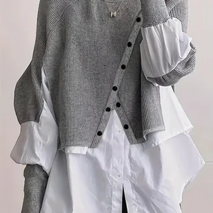 TEMU Koszula Damska z Eleganckim Długim Rękawem - Kontrastowe Kołnierzyki i Mankiety w Kolorze Czarno-Białym, Okrągły Dekolt, Regularny Krój, Pranie