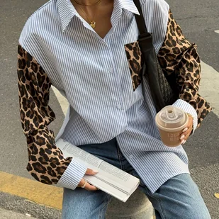 TEMU Koszulka Casual z Rękawami w Leopard Kolorowe Bloki dla Kobiet