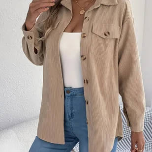 TEMU Kurtka z Długim Rękawem w Teksturze Sztruksu dla Kobiet - Pralna, Jednokolorowa Kardigan na Guziki, Wszechsezonowy Strój do Codziennego