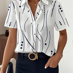 TEMU Letnia Koszula w Paski z Krótkim Rękawem i Groszkami dla Kobiet - Elegancki Kołnierzyk, Biała Podstawa z Niebiesko-Czarnym Wzorem, Idealna na