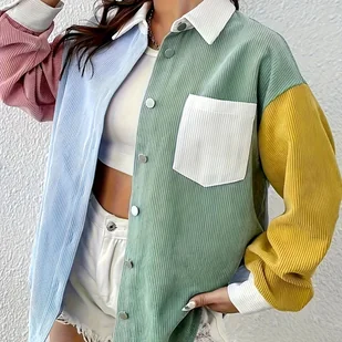 TEMU Modna Elegancka Kurtka z Kolorowymi Blokami, Zapinana na Guziki i Łatkowe Detale w Stylu Patchwork – Luźny Kordowy Żakiet dla Każdej Okazji