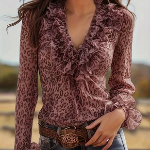 TEMU Różowa koszula z szyfonu w panterkę z dekoltem w serek i długim rękawem Eleganckie falbanki, idealna na wiosnę//jesień