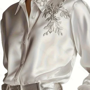 TEMU Satynowa Koszula z Białym Haftem w Srebrne Rośliny