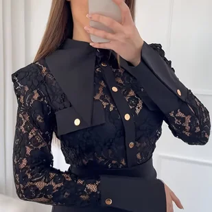 TEMU Seksowna Bluzka z Kołnierzykiem i Długim Rękawem - Jednokolorowa, Półprzezroczysta Koszula, Możliwość Prania w Pralce, Idealna do Biura, na