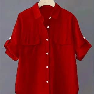TEMU Stylowa czerwona bluzka damską z krótkim rękawem, marszczonym brzegiem i detalami guzikowymi - lekka koszula letnia do codziennego użytku lub do