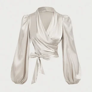 TEMU stylowa i elegancka koszula damska z dekoltem w serek i długim rękawem, z kokardą, o asymetrycznym krzyżowym kroju w jednolitym kolorze [Letni