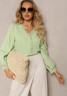 Zielona Bawełniana Koszula Zapinana na Guziki z Ozdobną Koronkową Tasiemką Raniatte