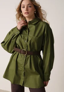 Zielona Długa Koszula Oversize z Bawełny i Wiskozy z Paskiem z Klamrą Thessalonike