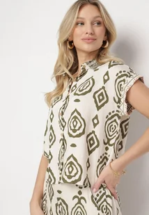 Beżowo-Zielona Koszula z Wiskozą na Krótki Rękaw w Etniczny Wzór Avineria