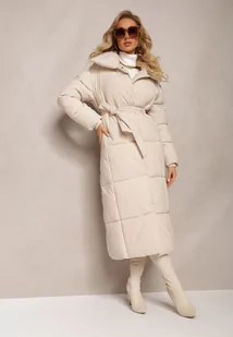 Beżowa Długa Kurtka Pikowana z Paskiem Adellesstta