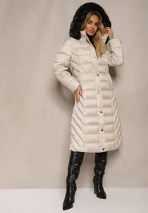 Beżowa Długa Kurtka Zimowa z Pikowanymi Przeszyciami i Odpinanym Kapturem z Futerkiem Tinnelia