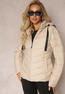 Beżowa Jednolita Kurtka z Pikowaniem Kieszeniami i Suwakiem oraz Kapturem Sassana
