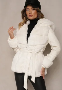 Beżowa Kurtka Futerko z Ekoskórzanymi Rękawami z Klamrami Kapturem i Wiązanym Paskiem Mesizelle