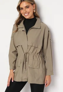 Beżowa Kurtka Parka z Bawełną Ściągana w Pasie Troczkiem Zapinana na Napy Velethra