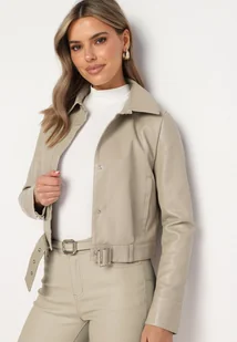 Beżowa Kurtka z Ekoskóry o Fasonie Ramoneski z Paskiem Velaine