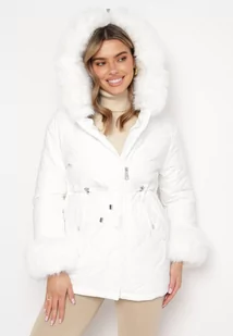Biała Kurtka Ozdobiona Futerkiem ze Ściągaczami w Talii i Kapturem Atermi