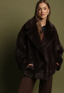 Brązowa Kurtka Futerko o Dwurzędowym Kroju Oversize Nalizana