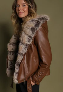 Brązowa Kurtka Ramoneska z Odpinanym Kapturem i Futrem Aplonna