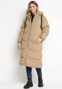 Ciemnobeżowa Długa Kurtka Pikowana Płaszcz na Zamek z Kapturem Lesea