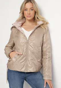 Ciemnobeżowa Kurtka Pikowana z Odpinanym Kapturem i Ściągaczami po Bokach Nusarianis