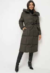 Ciemnozielona Długa Kurtka Pikowana z Kapturem i Wysokim Kołnierzem Wiązana w Talii Zevrira