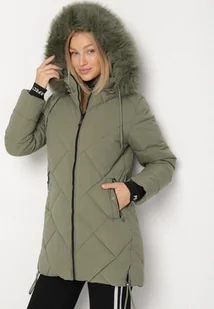 Ciemnozielona Pikowana Kurtka z Kapturem z Futrem i Ściągaczami przy Rękawach Dacce