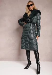 Ciemnozielona Pikowana Kurtka za Kolano z Wiązanym Paskiem i Futerkiem Vivenda