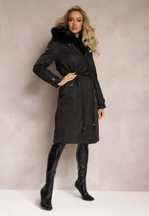 Czarna Długa Kurtka Parka Nylonowa z Futrzanymi Wstawkami Rinale