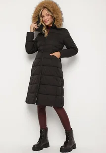 Czarna Długa Kurtka Pikowana z Kapturem z Futerkiem i Paskiem w Talii Avesiia
