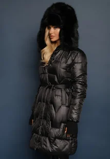 Czarna Długa Kurtka Pikowana z Odpinanym Kołnierzem i Paskiem Rinarella