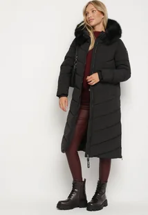 Czarna Długa Kurtka z Pikowanymi Przeszyciami i Kapturem z Futerkiem Galella