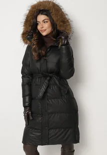 Czarna Długa Pikowana Kurtka z Kapturem Odpinanym Futerkiem i Paskiem w Talii Serenira