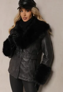 Czarna Ekoskórzana Kurtka Zdobiona Futerkowymi Obszyciami z Paskiem w Talii Etindra