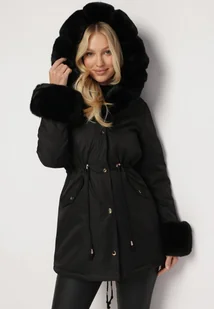 Czarna Kurtka Parka z Futerkiem i Kapturem Aresja