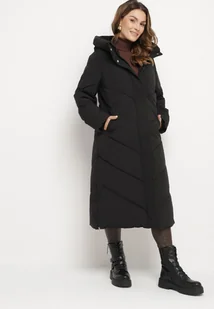 Czarna Kurtka Pikowana o Długim Fasonie z Nieodpinanym Kapturem i Kieszeniami Nerilani