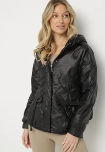 Czarna Kurtka Pikowana w Stylu Cargo o Krótszym Fasonie z Kapturem Varedia