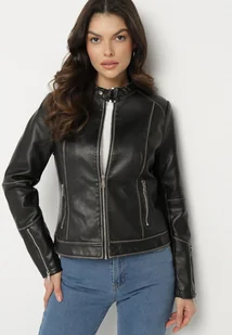 Czarna Kurtka w Stylu Ramoneski z Ozdobnymi Paskiem i Suwakami Idivane