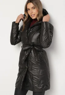 Czarna Kurtka z Pikowanymi Przeszyciami Kapturem i Wiązanym Paskiem Erlexie