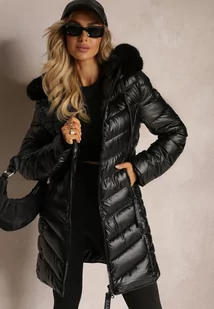 Czarna Ocieplona Kurtka Pikowana z Kapturem i Futrzanym Kołnierzem Varella