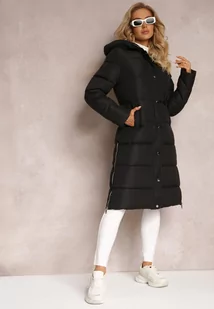 Czarna Pikowana Długa Kurtka z Kapturem i Napami Tisima