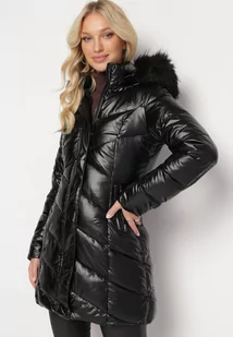 Czarna Pikowana Kurtka przed Kolano z Kapturem i Futerkiem Salasa