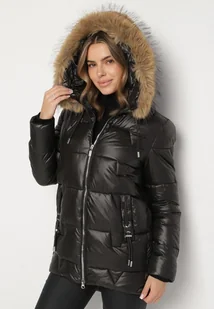 Czarna Pikowana Kurtka z Kapturem z Odpinanym Futerkiem Galiara