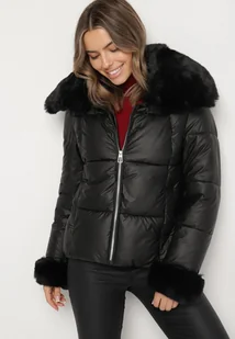 Czarna Pikowana Kurtka z Szerokim Kołnierzem z Futerkiem Galerra