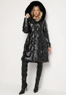Czarna Zimowa Kurtka Pikowana o Długim Kroju z Kapturem z Odpinanym Futrem Lilareen